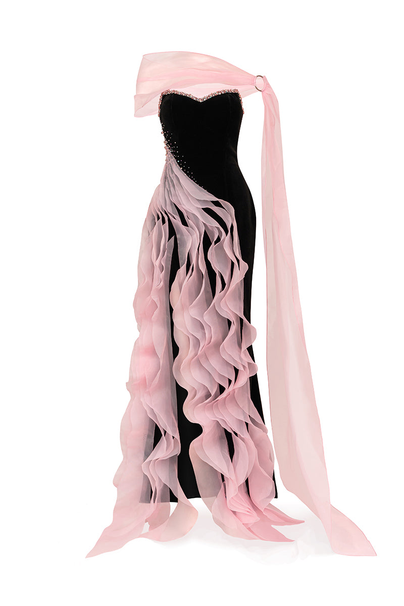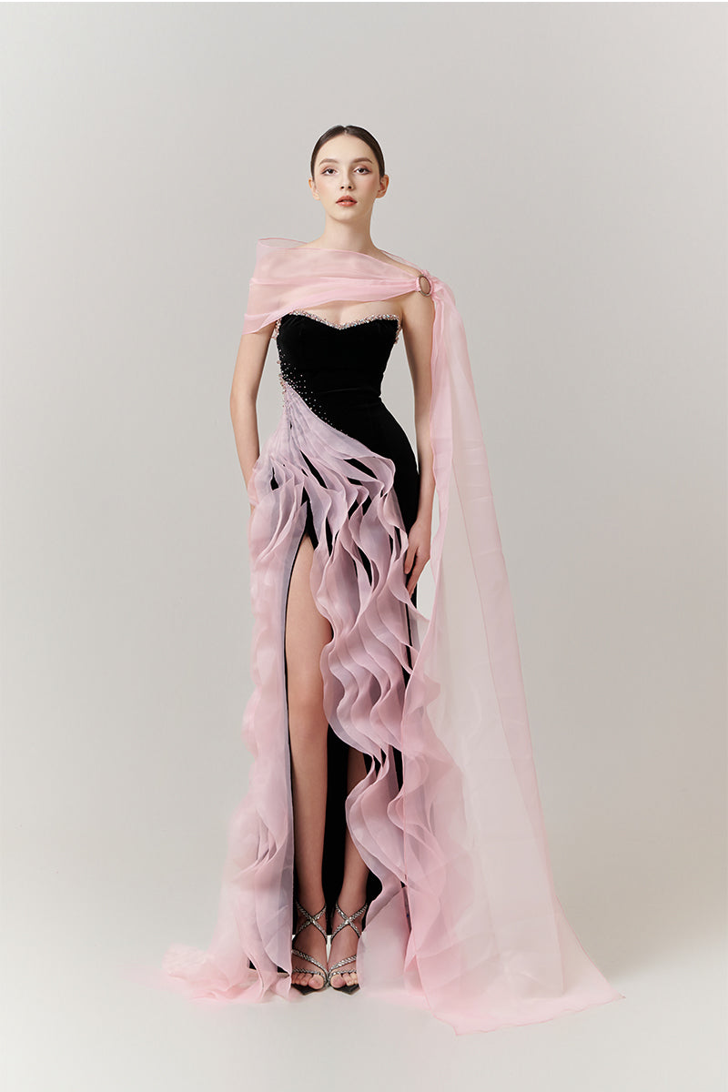 Designed with a sleek, body-contouring silhouette, this gown is elevated by a dramatic cascading skirt treatment that moves like soft waves with every step. The high slit and flowing panels enhance the lower form, bringing together elegance, motion, and wearability for galas, red-carpet moments, and upscale celebrations.