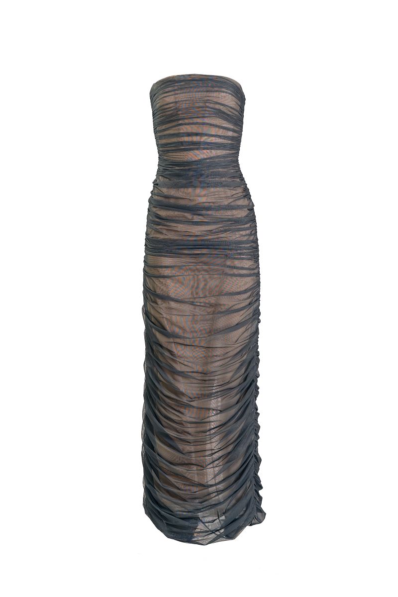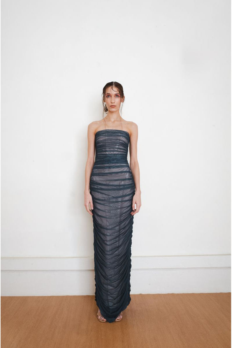 Strapless gown crafted from teal stretch tulle, softly draped across the body to form a sleek, minimalist column silhouette. The bodice is reinforced with a corset.