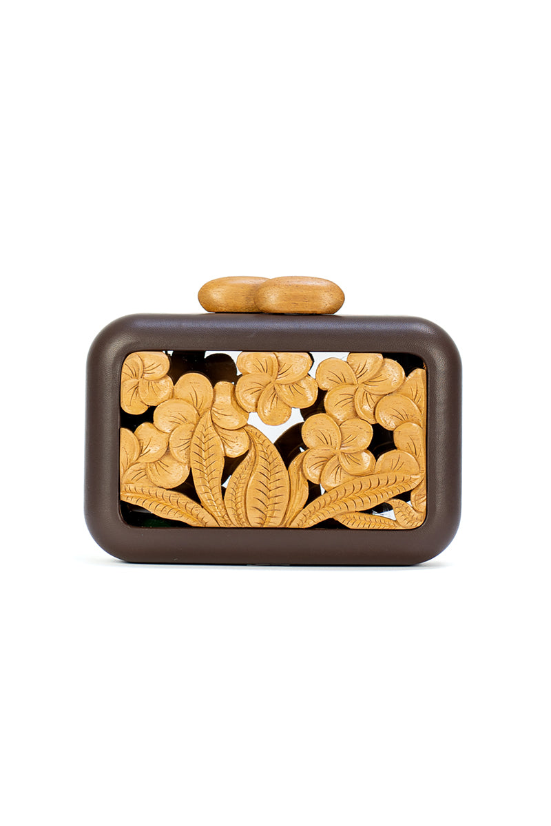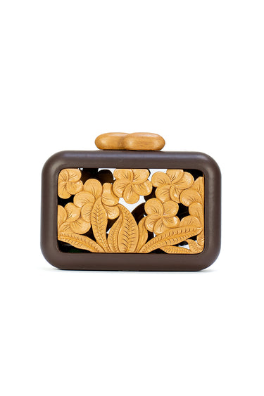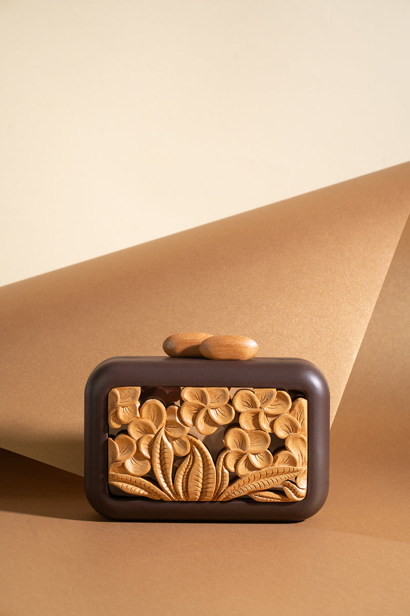 - Handcrafted clutch bag with cedar wood carved plaque