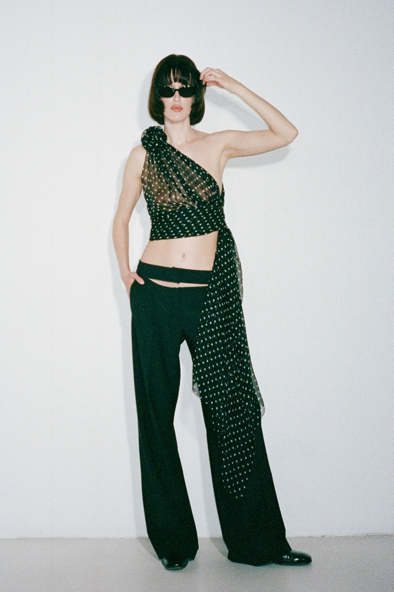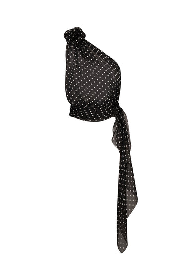 An asymmetric one-shoulder gathered top made of semi-sheer silk chiffon features a polka-dot pattern and elongated sides that fall to one side. It is adorned with a floral applique.