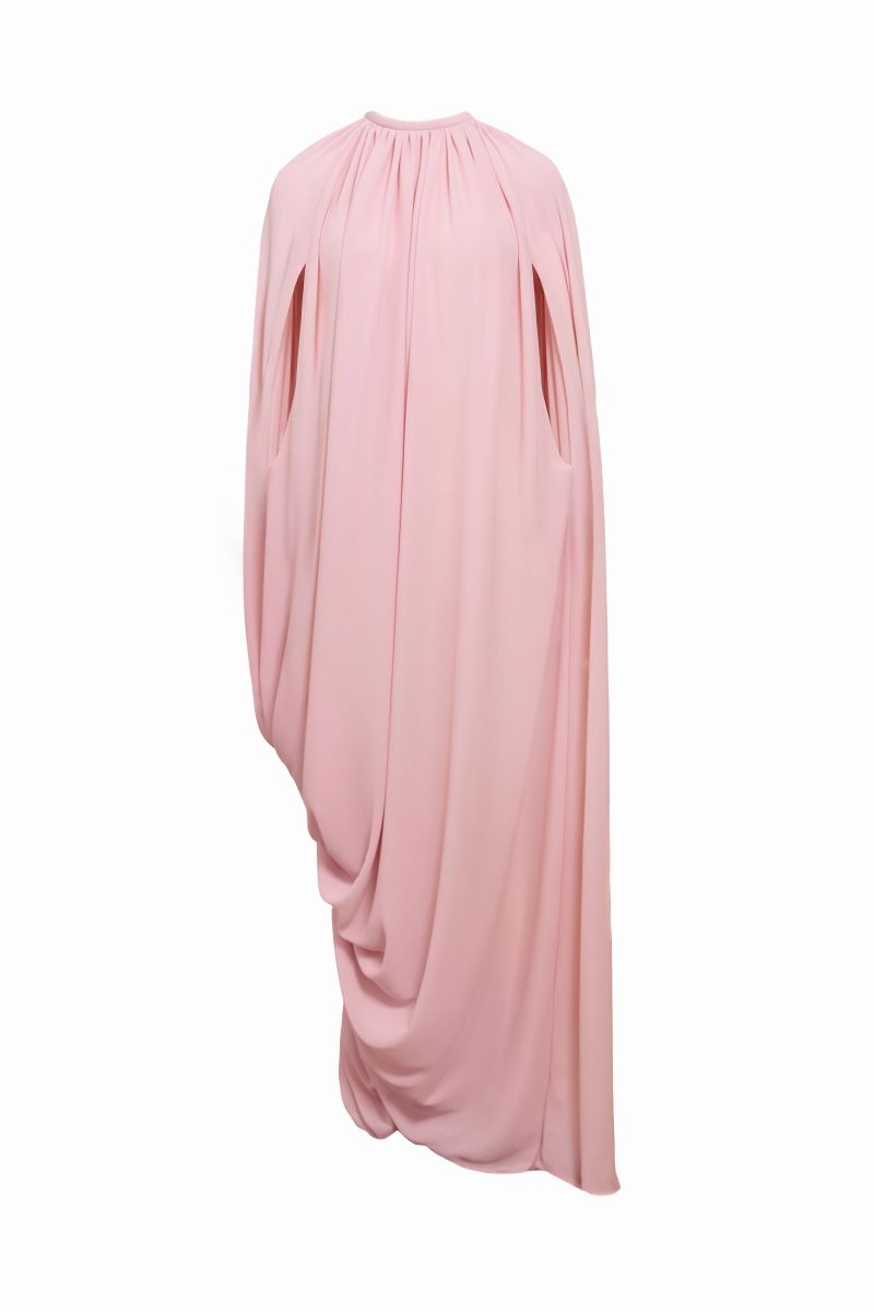Floor-length gown cut from soft crepe, designed with an abaya-inspired silhouette featuring a gathered neckline and fluid cape-like panels draping over the arms.