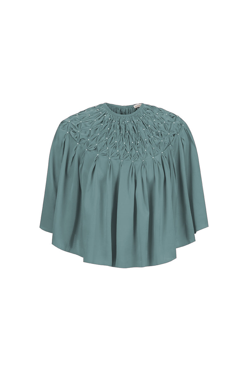 The MASTANI Tiya Embellished Cape is meticulously crafted from 100% hand-loomed silk satin in Saxon. It features a round neckline fastened with buttons at the back, allowing the fabric to drape elegantly across the shoulders and chest. The design is enhanced by intricate hand-smocking and highlighted by delicately hand-stitched silver seed beads accented with red.