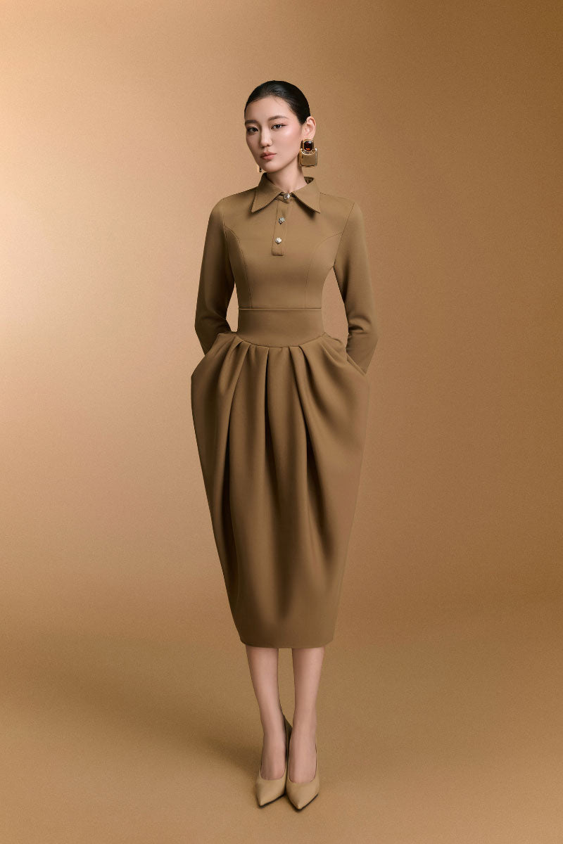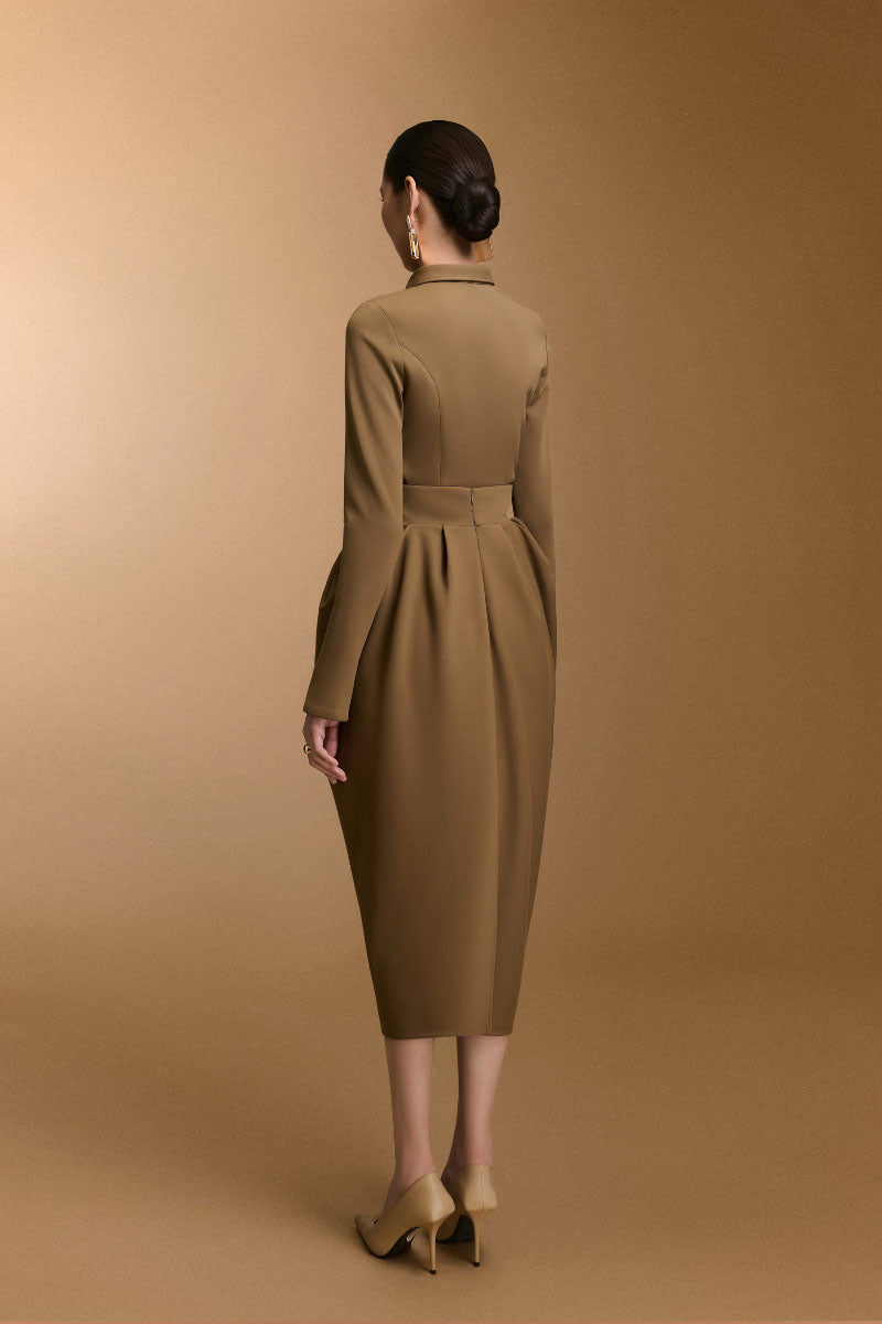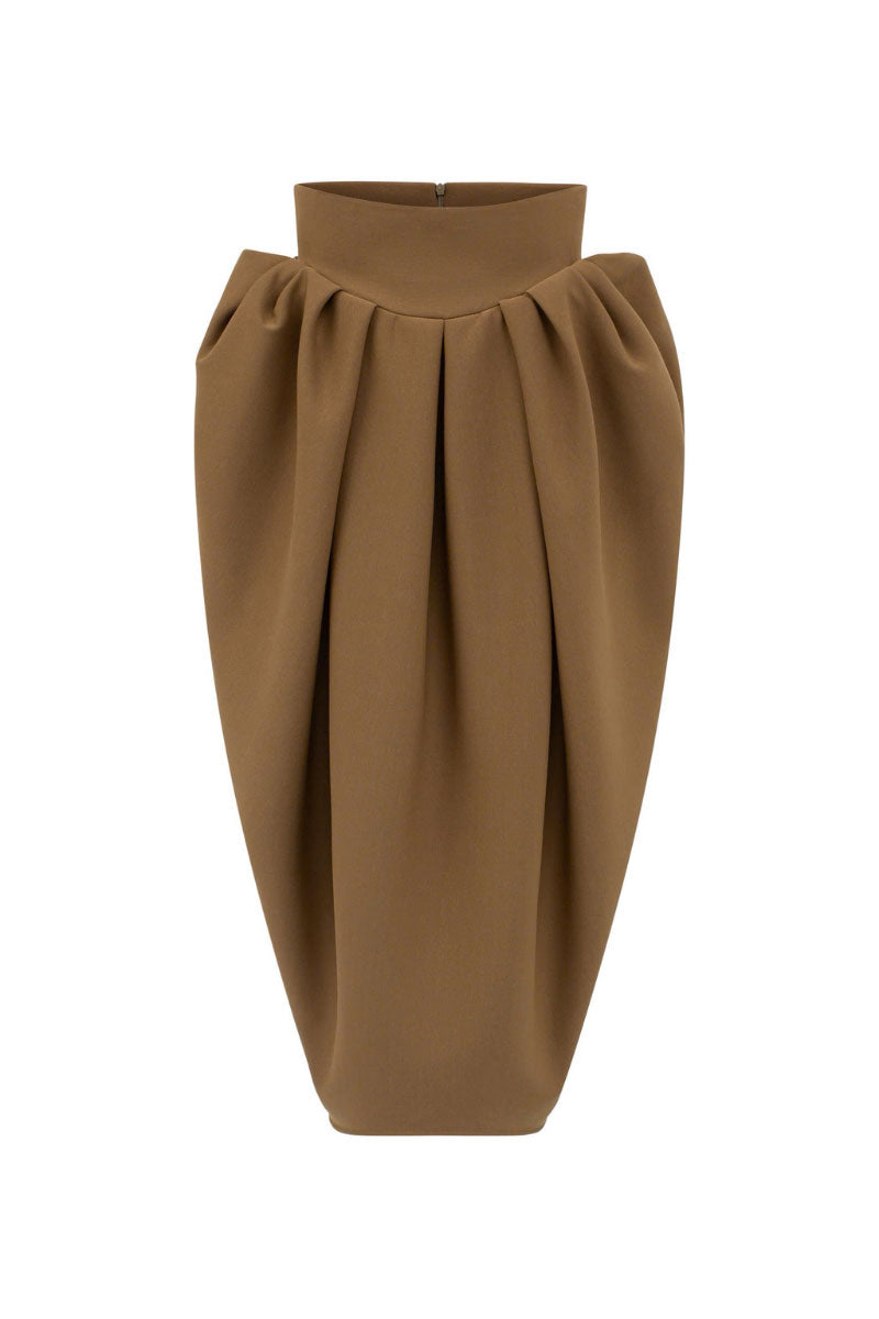 A high-waisted skirt featuring ruched hip details that form a youthful bubble silhouette, accentuating the curves with a flattering fit. The design blends elegance with a sense of authority, making it perfect for business meetings, client encounters, and professional formal occasions.