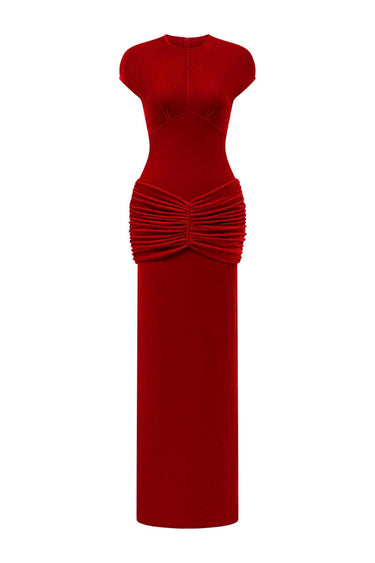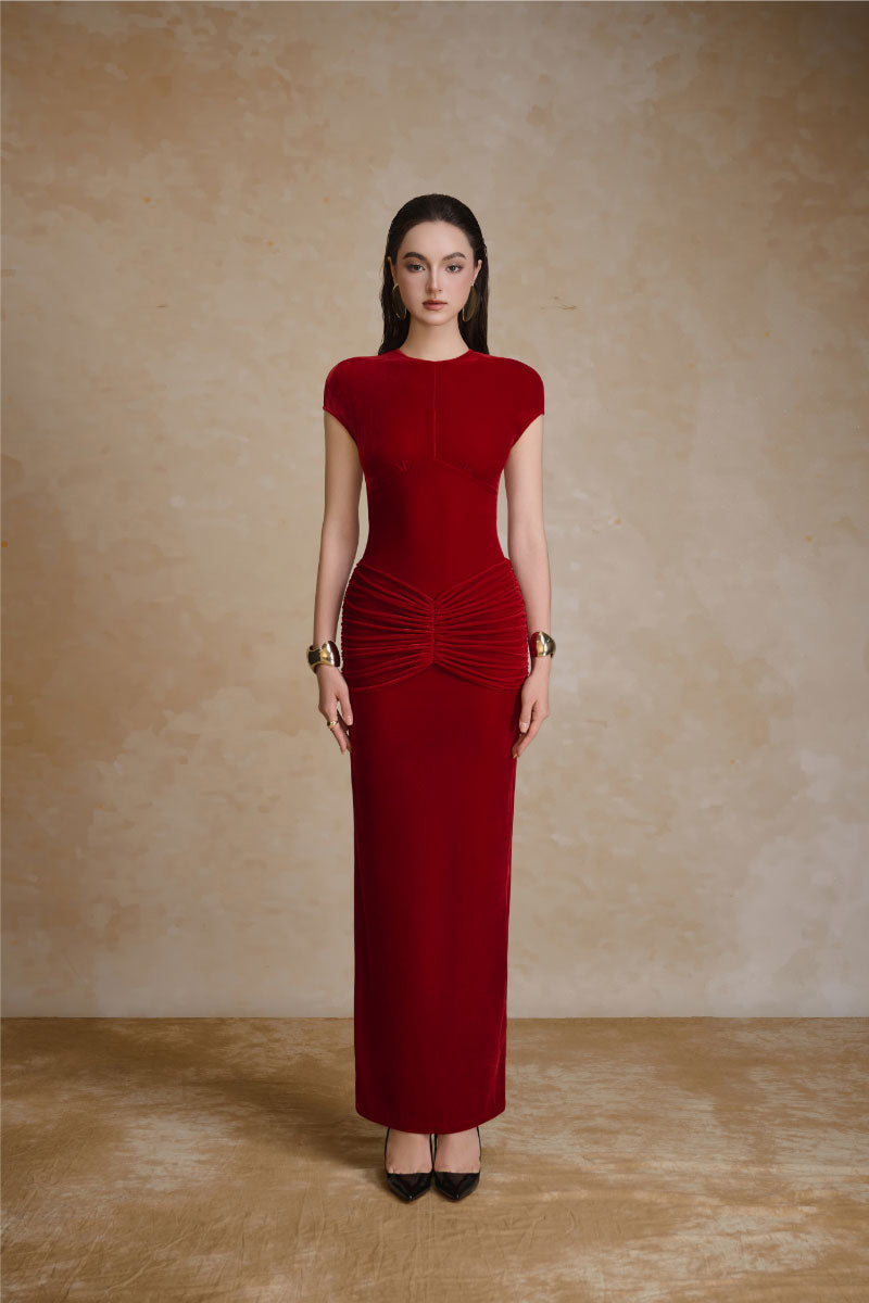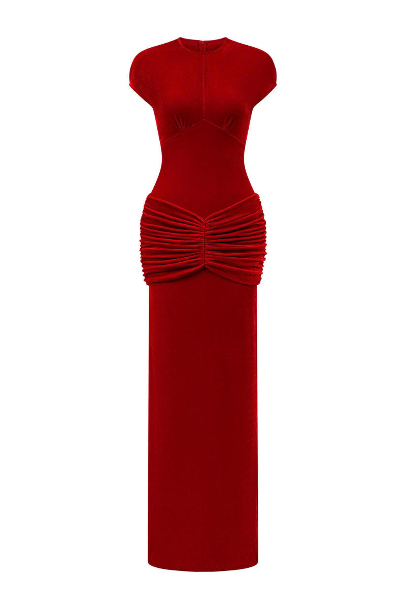 A bodycon dress featuring an underbust cut, structured extended shoulders, and ruched detailing at the hips that accentuates the waistline. Crafted from lustrous bright red velvet, it radiates sophistication, sensuality, and timeless allure.