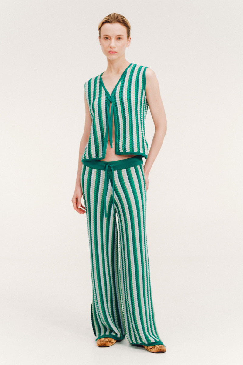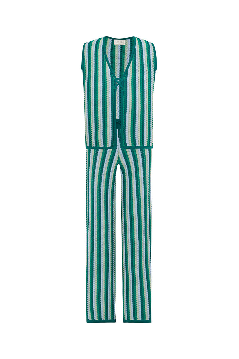- Vertical crochet- knit stripes in green and ivory tones