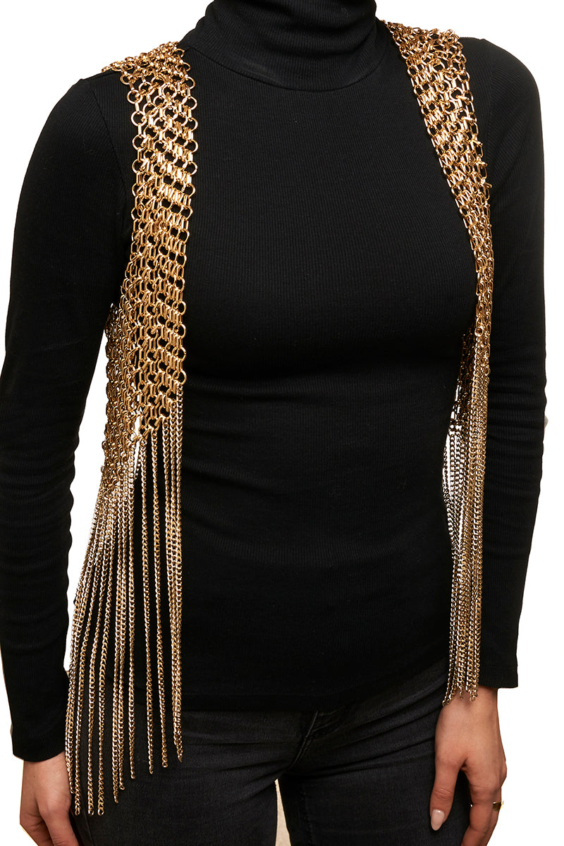 The Gilet in Gold is a bold statement piece crafted from handmade metal mesh, designed to drape the body with fluid elegance.