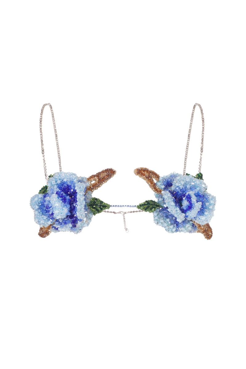 Indulge in the exquisite craftsmanship of our HANDMADE FLOWER EMBELLISHED BRA, featuring intricate blue beadwork and a loose fit that stays true to size.