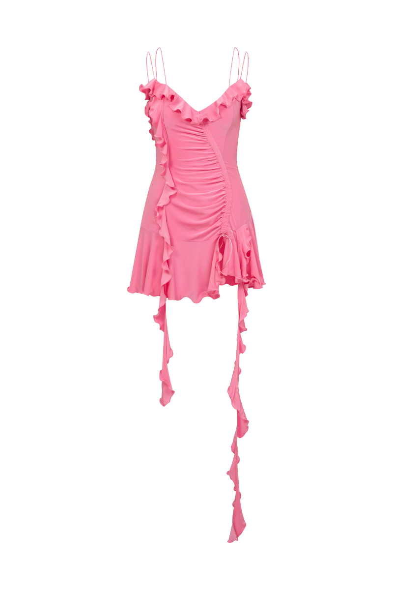This pink jersey dress features mini ruffle details, a center back zipper, and a fitted silhouette. It is true to size, adding a touch of luxury to your wardrobe.
