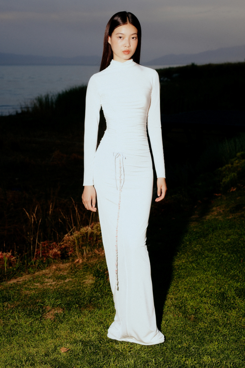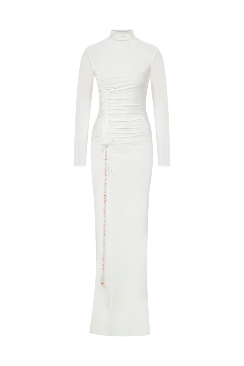 This white jersey maxi dress boasts long sleeves and natural stone accents, making it a luxurious choice. It is also fitted and true to size for a flattering silhouette.
