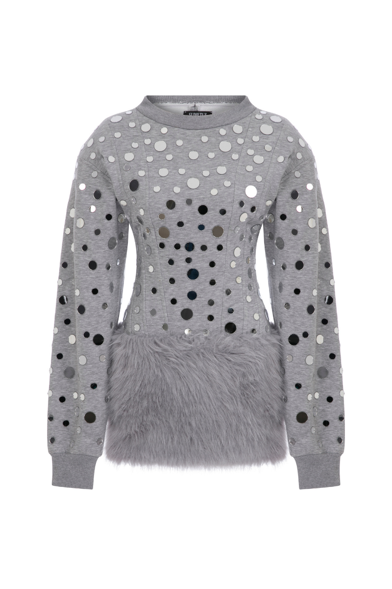 mirror covered sweater mini dress with faux fur skirt