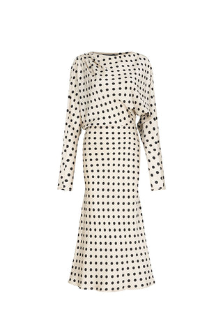 The design combines a sleek boat neckline and relaxed, full long sleeves with a midi-length pencil skirt that includes a subtle side split. The cohesive pattern and elegant drape create a luxurious, unbroken silhouette, offering a modern take on timeless glamour.