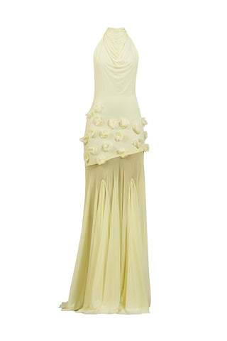 This elegant, butter-yellow malai lycra gown features a high neckline, delicate organza flowers, and flannel panels, showcasing timeless beauty with a contemporary twist.