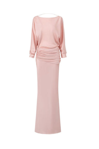 Crafted from luxurious satin silk, this elegant evening gown embodies refined sophistication. The gown features a classic boat neckline and long sleeves, adding a touch of timeless grace.