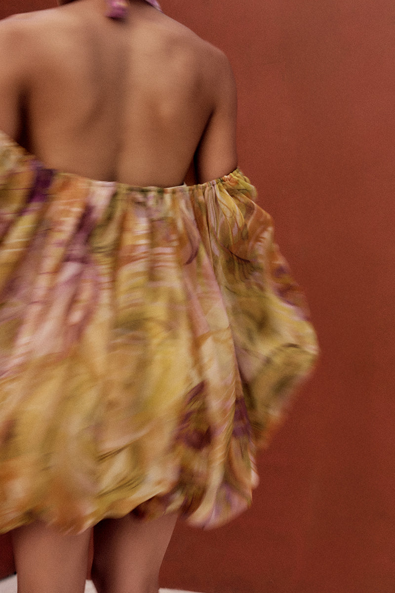 Voluminous and playful, the BAYO Bubble Dress in Vibra Print is designed to make a statement. Made from airy organza with a halter neckline, it features heavy shirring at the hem and neckline for bold shape, plus wooden trim and elasticated sleeves for added textural appeal.