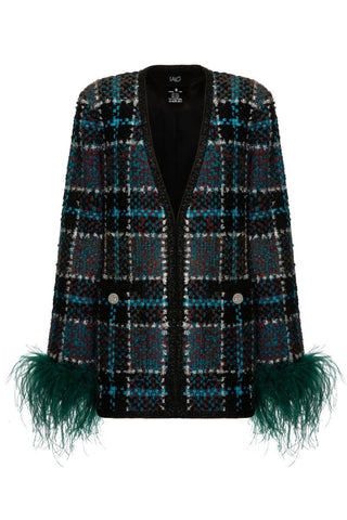 checkered blue wool-blend jacket with green feather-detailing