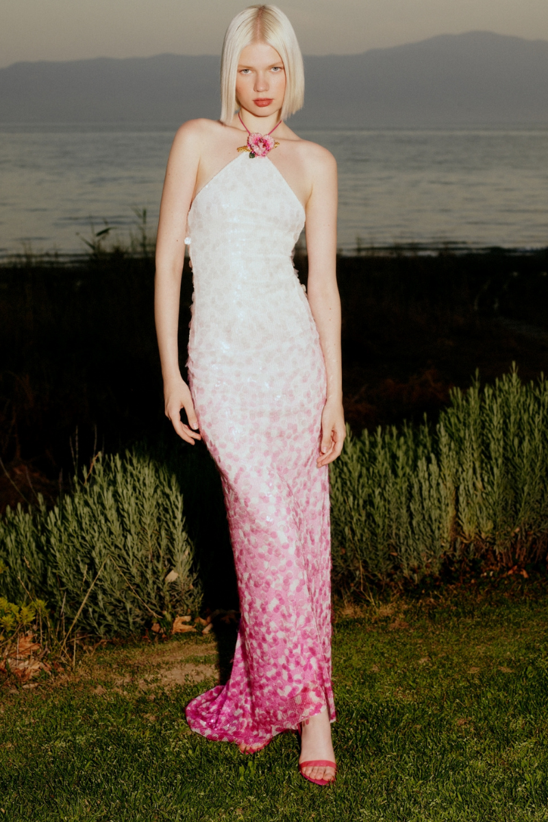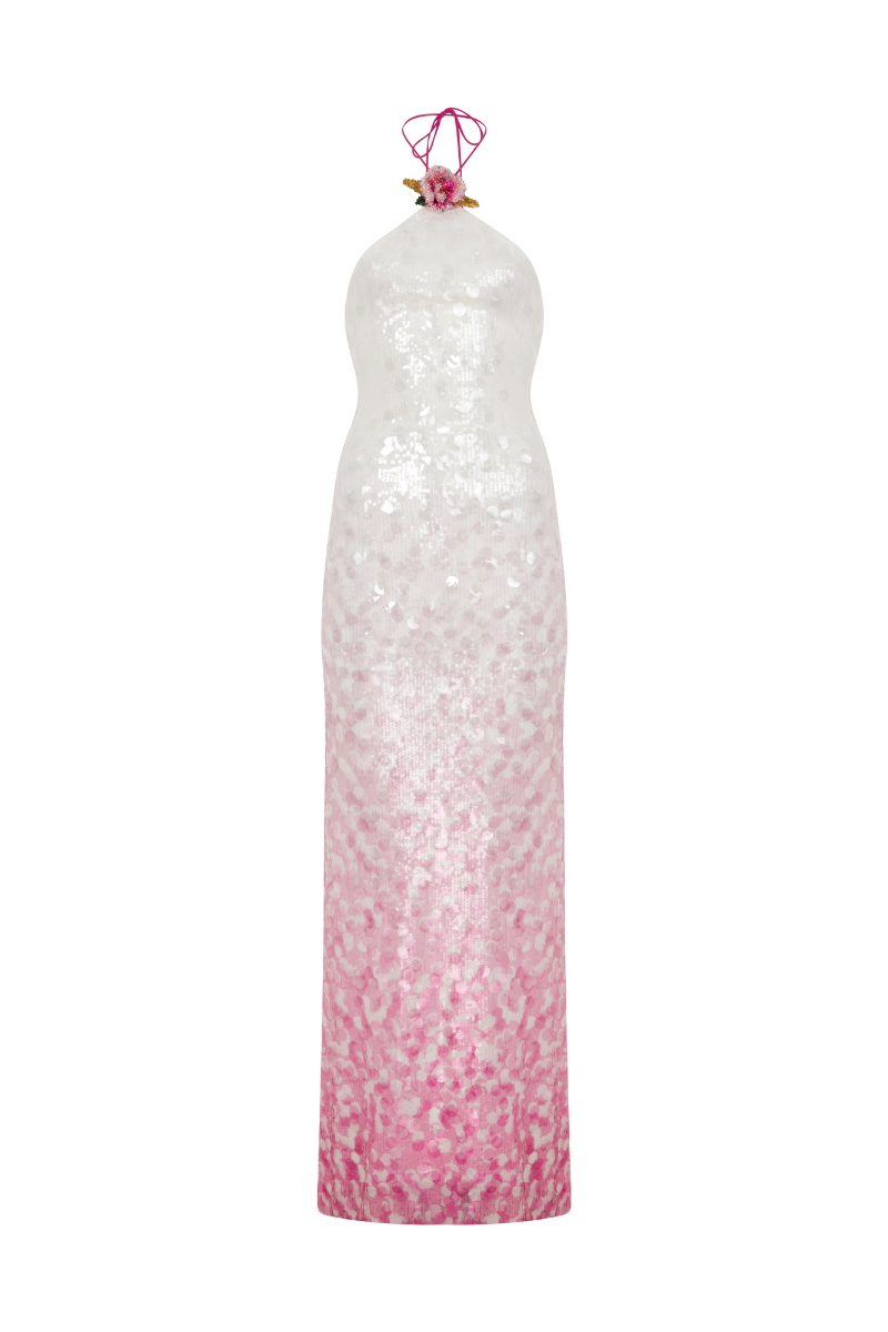 Enhance your style with this luxurious halter neck backless dress in a stunning white to pink gradient, featuring hand-beaded flower detailing and a fitted silhouette in a maxi length. Made with stunning sequin fabric and true to size for the ultimate comfort and style.