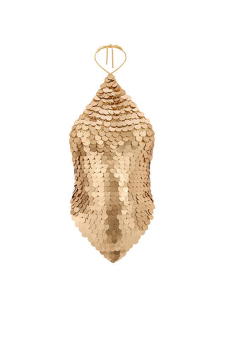 hand-crochet sequin embellished open back top in matte gold