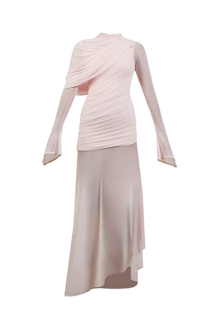 This baby pink ensemble, crafted from luxurious Malai and Net, features artful drapes, long sleeves, and meticulous ruching, while the net skirt flows freely for a striking effect.