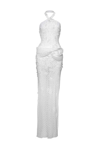 - A halter-neck straight silhouette, elevated by 3D draped floral details and delicately embellished lace.