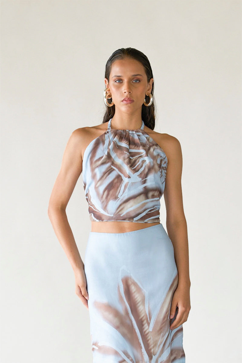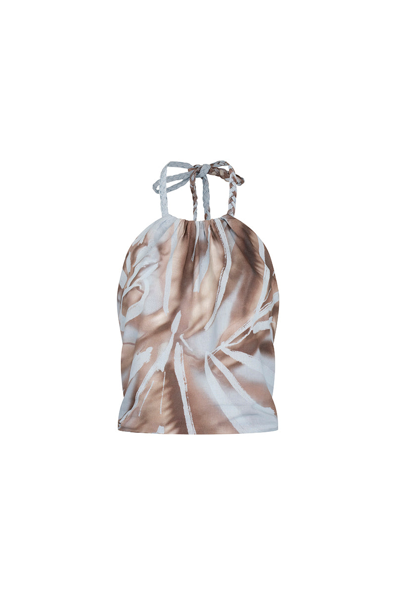 This halter top features braided straps and long back ties that can be styled in multiple ways - knotted into a bow at the back or crossed around the waist for a wrapped effect. With a botanical print, developed in-house, it's a versatile separate designed to pair effortlessly.