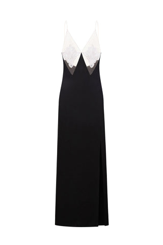 An elegant maxi slip dress with a plunging V-neckline, crafted from viscose cady. It features a high front slit and is outlined with nude mesh along the bodice, accentuated by contrasting lace details. Concealed zip fastening at the back.