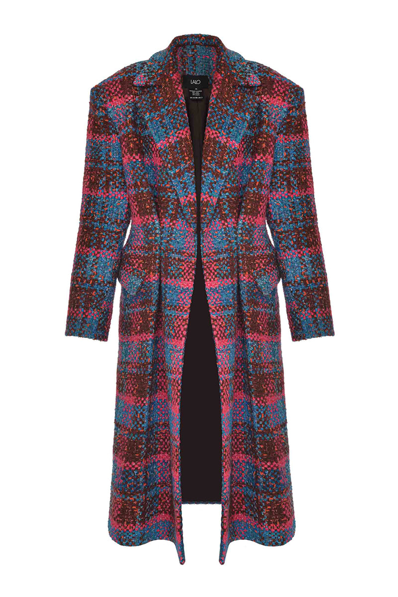 pink and blue checked wool coat