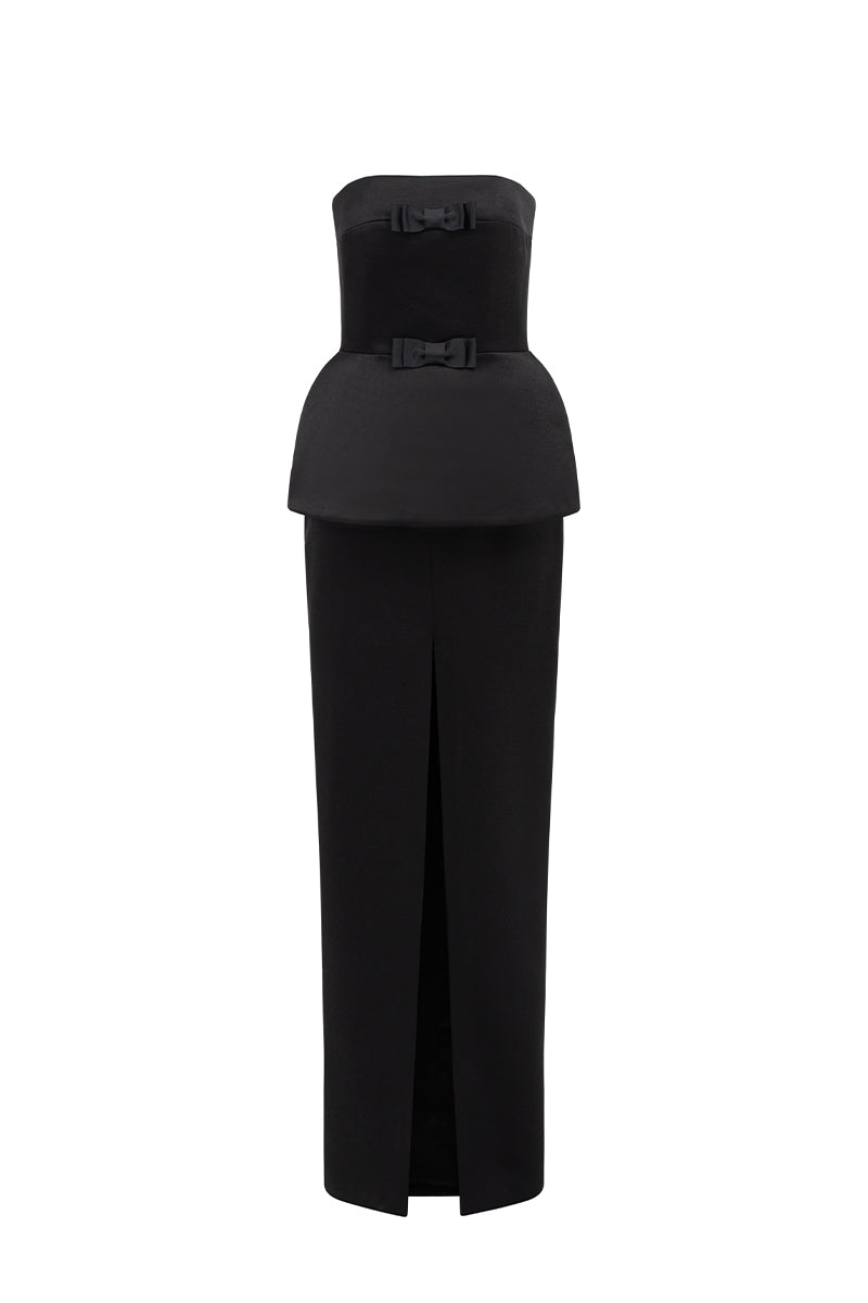 Sculptural and poised, this Taffeta Strapless Peplum Column Gown redefines evening elegance with architectural clarity. Featuring a fitted bodice with double bow detailing, the exaggerated peplum flares from the waist to enhance proportion, while the sleek column skirt with front slit adds fluidity and confidence. A refined silhouette that balances strength and sophistication.