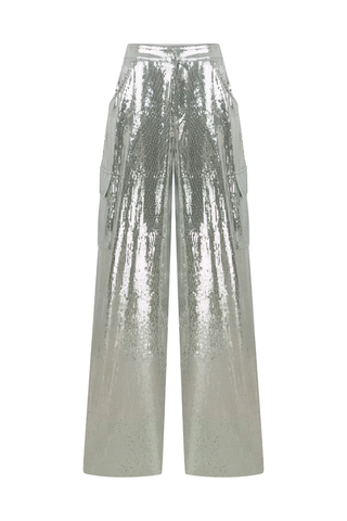 These cargo pants feature a stunning silver sequin fabric and a low waist for a flattering silhouette. The wide-leg design and zipper detailing add a touch of sophistication. It has a full length and is true to size for a perfect fit.