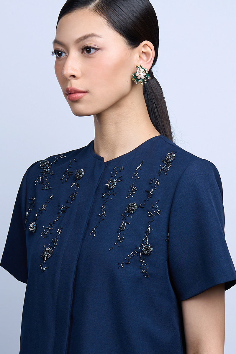 - Adorned with yellow crystals and green beads intricately arranged in cascading form