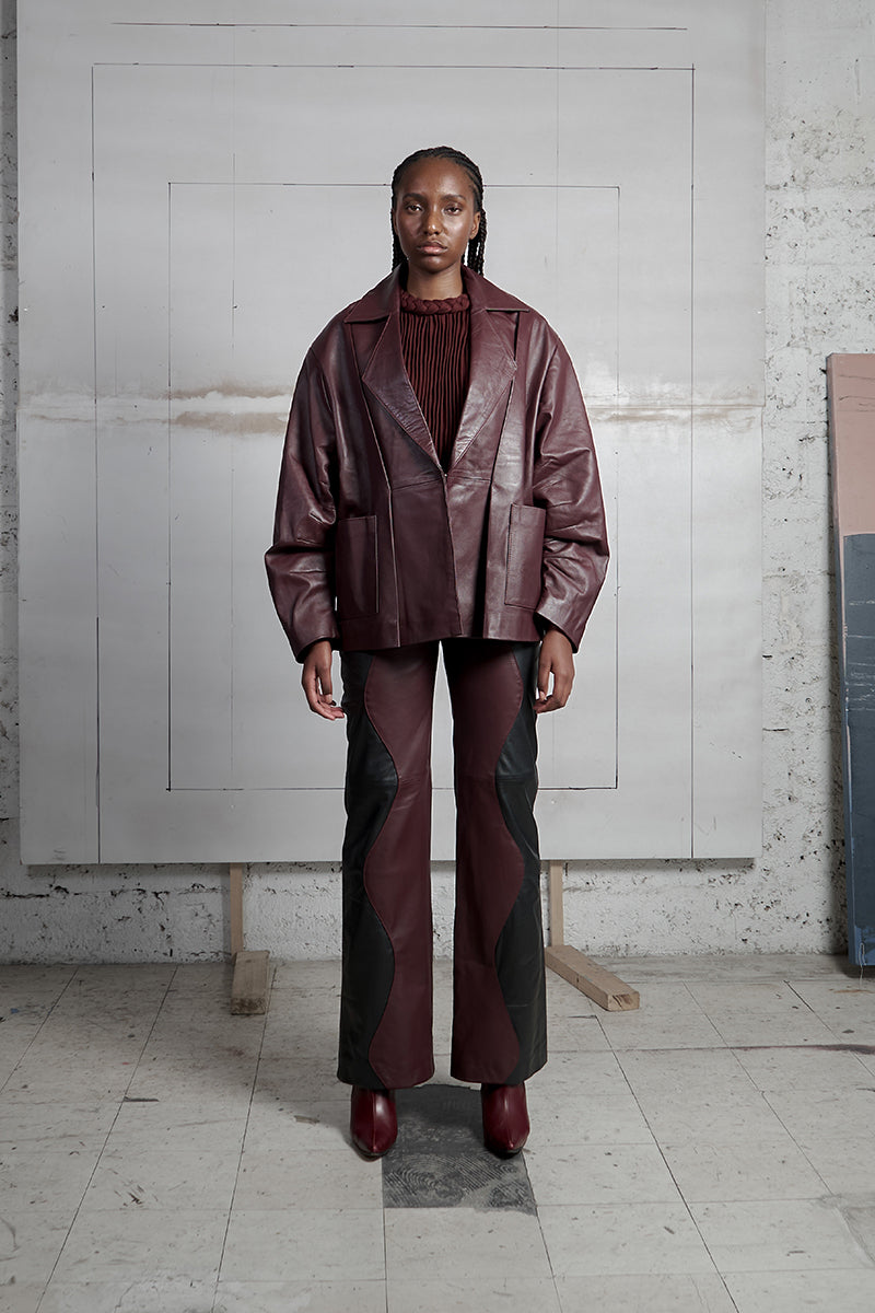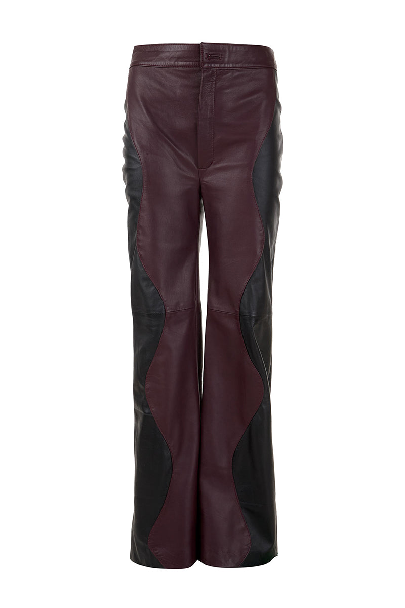 two-tone leather mountains trousers in black and wine red