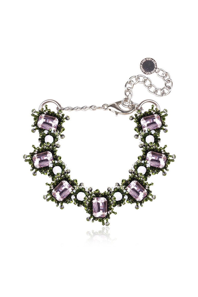 Le collier est enfilé de cristal acrylique, décoré de perles de rocaille en argent tridimensionnelles et de cristal acrylique avec des accents carrés étincelants en vert.