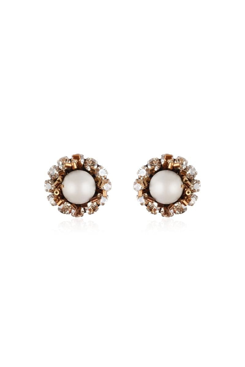 Les boucles d'oreilles à pois sont moulées à partir de perles d'eau ornées d'embellissements 3D de perles de rocaille de couleur or et de cristaux acryliques de couleur miel.