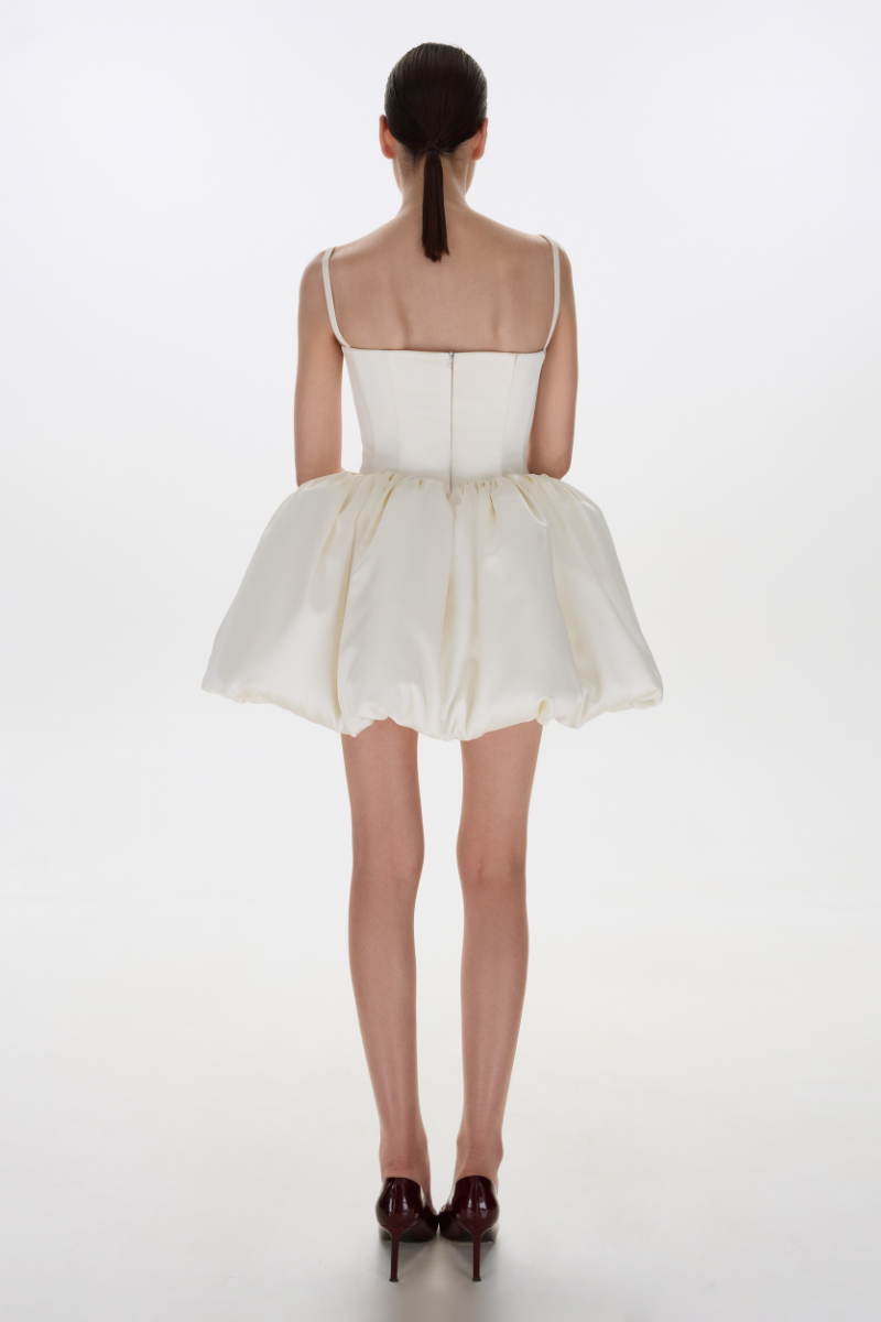 Une mini-robe à la coupe sculpturale et volumineuse. Le tissu ivoire met en valeur les lignes architecturales tout en conservant une allure légère et moderne.