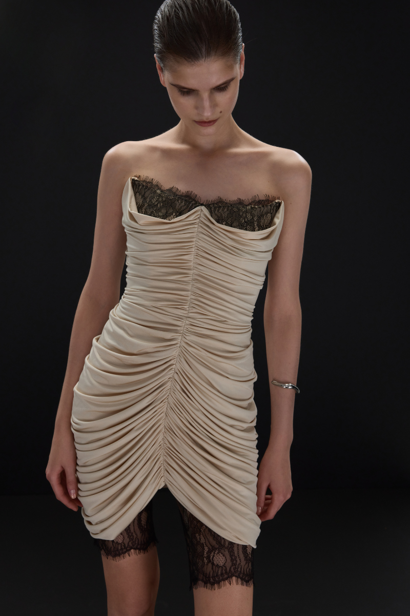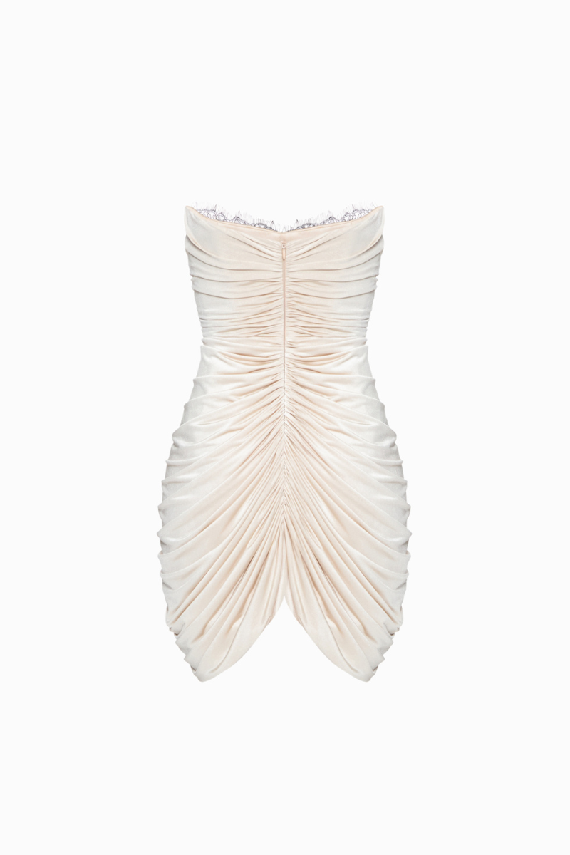 Une mini-robe structurée à la coupe asymétrique qui met en valeur la taille et les jambes. La teinte beige adoucit les lignes géométriques audacieuses du modèle.