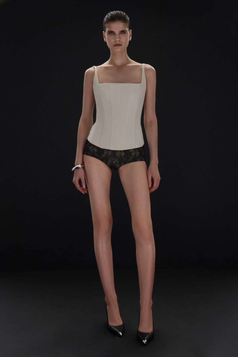 Un corset sculptural en soie mate, conçu pour définir la taille. La teinte beige adoucit la silhouette structurée.