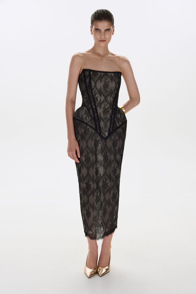 Une robe midi cintrée en dentelle délicate. Sa coupe ajustée épouse les lignes naturelles du corps, alliant féminité et élégance raffinée et affirmée.
