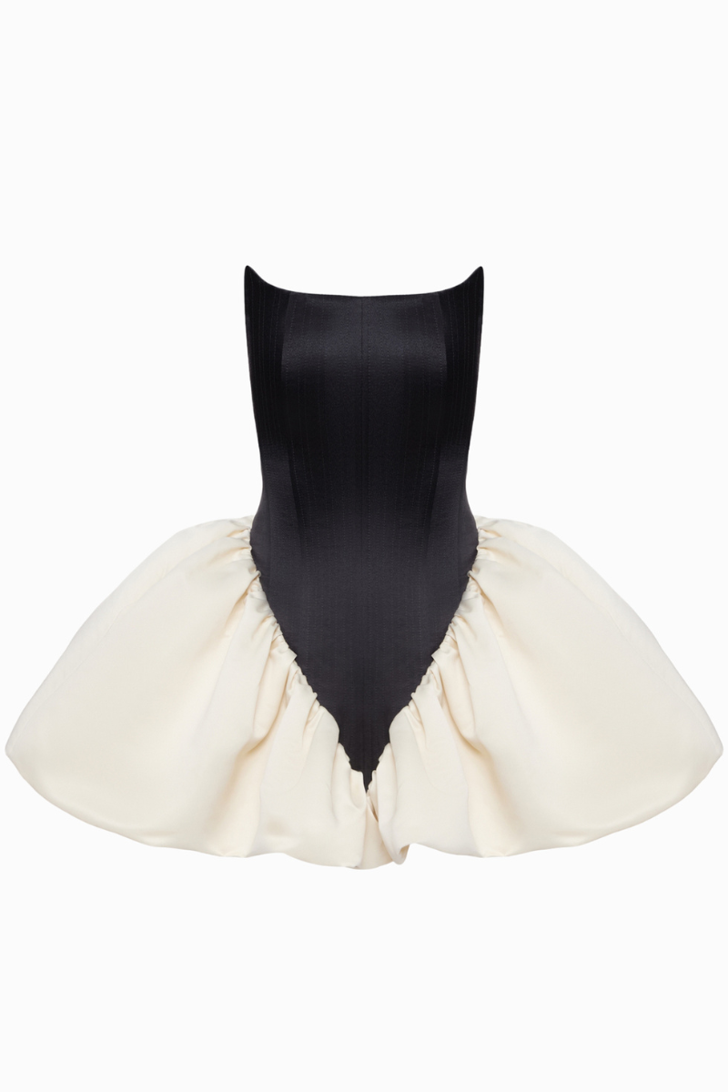 Une mini-robe bicolore à jupe ballon spectaculaire. Le volume sculptural équilibre la silhouette ajustée du haut.