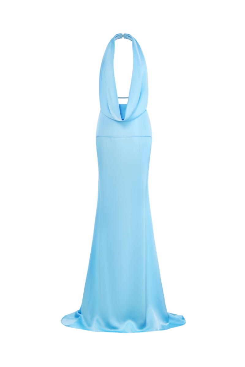 Cette robe captivante est confectionnée dans un satin bleu ciel brillant qui s'évase naturellement jusqu'au sol, créant une silhouette à la fois sensuelle et sophistiquée. Le décolleté plongeant plonge dans un profond drapé, révélant le décolleté et apportant une élégance fluide d'inspiration grecque. Les découpes latérales accentuent la taille, sublimant la silhouette en sablier avec une allure moderne. La jupe épouse les hanches avant de s'évaser délicatement en une traîne subtile, soulignant le drapé luxueux et le mouvement de la robe. Ce modèle est un véritable chef-d'œuvre de séduction raffinée, parfait pour attirer l'attention lors de toute cérémonie.