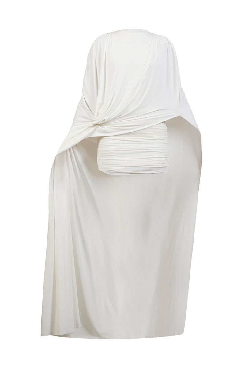 Cette robe courte blanche, confectionnée à partir d'un mélange de filet et de tissu malai, présente une coupe douce et sculptée et un long drapé spectaculaire, ce qui la rend parfaite pour les cocktails ou les moments de mariage modernes.