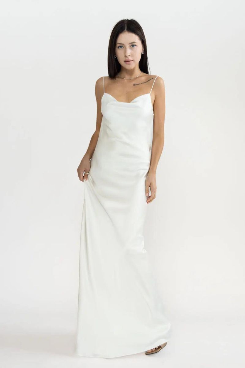 Imaginez une robe d'une beauté à couper le souffle, méticuleusement conçue dans une teinte ivoire immaculée. La robe Petra est un véritable témoignage d'élégance, avec non pas une, mais deux couches de satin de soie pure le plus fin qui glissent gracieusement sur une longueur maxi. La robe présente un charmant décolleté bénitier qui se fronce doucement, créant un drapé romantique qui se reflète de manière exquise dans un dos bénitier bas spectaculaire, insufflant au design un sentiment d'attrait et de grâce intemporelle. Les fines bretelles spaghetti offrent un attrait à peine visible, attirant l'attention sur les épaules et le dos.
