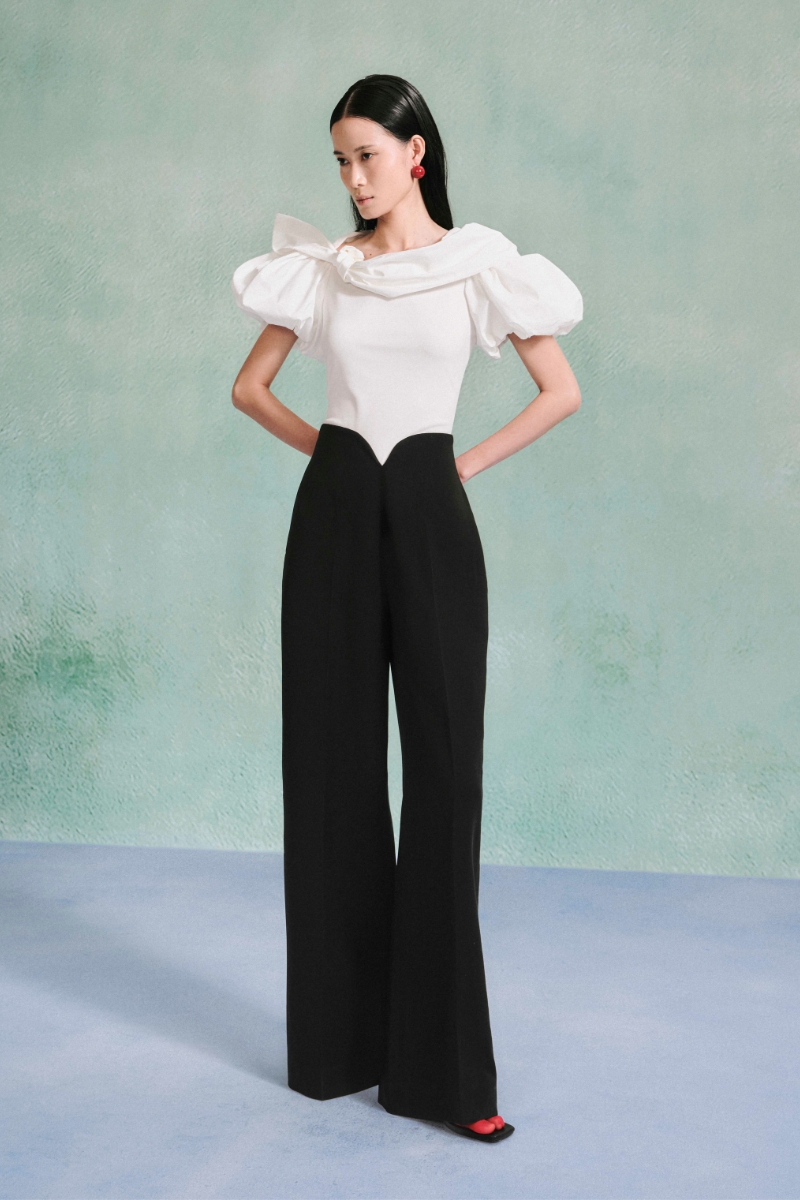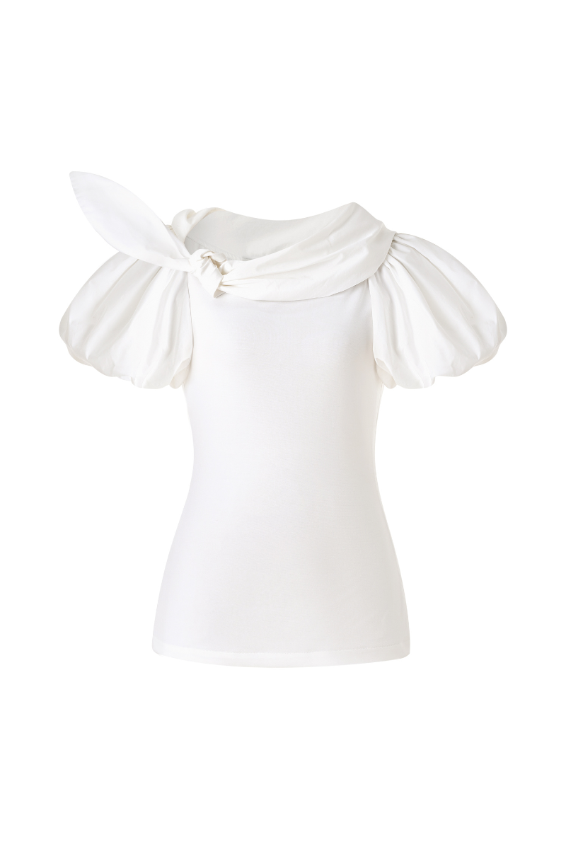 Haut blanc à épaules dénudées et manches bouffantes oversize en taffetas sculpté. Son encolure asymétrique se drape sur une épaule en rosace plissée. Confectionné dans un tissu structuré pour un effet volume et spectaculaire, il s'associe idéalement à des pièces taille haute pour une tenue de soirée raffinée.