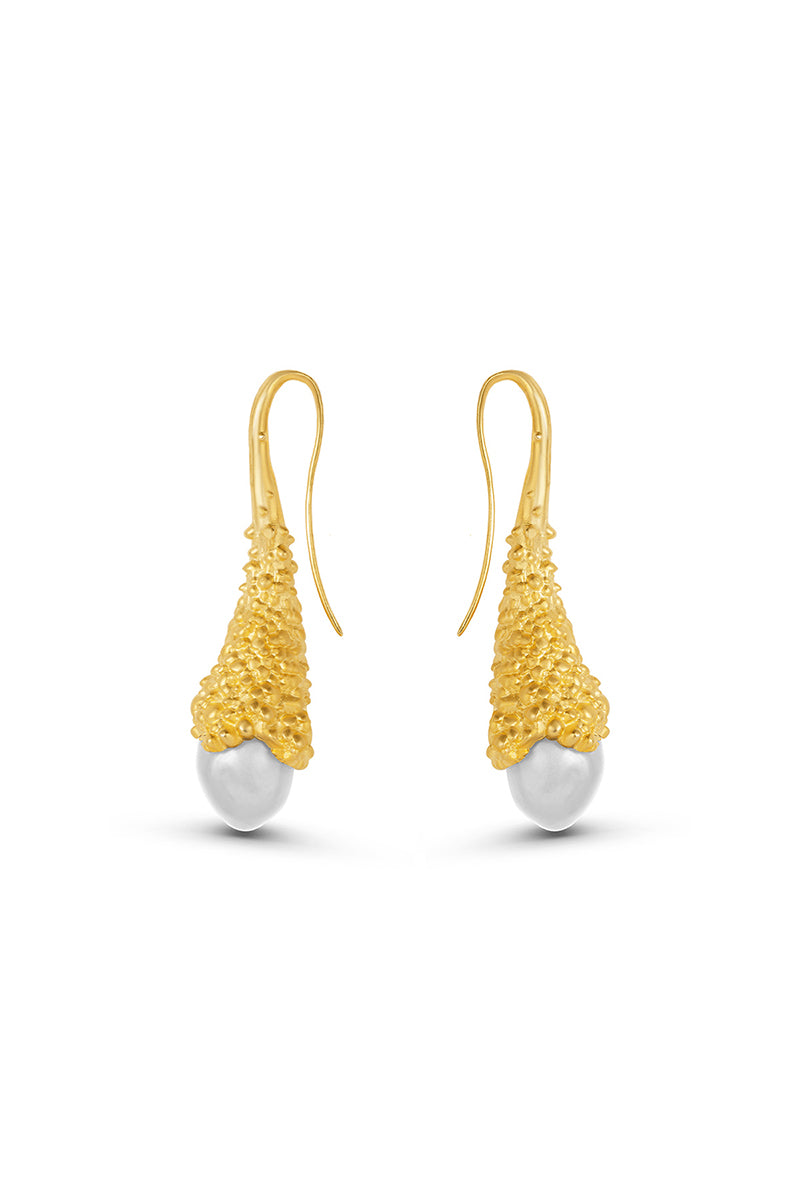 Les boucles d'oreilles Plunge présentent une goutte allongée qui se prolonge dans une boucle d'oreille effilée et étirée. Cette goutte est caractérisée par une pierre en résine teintée sur mesure, sertie dans une longue boucle d'oreille plaquée or, ornée de granules et de texture.