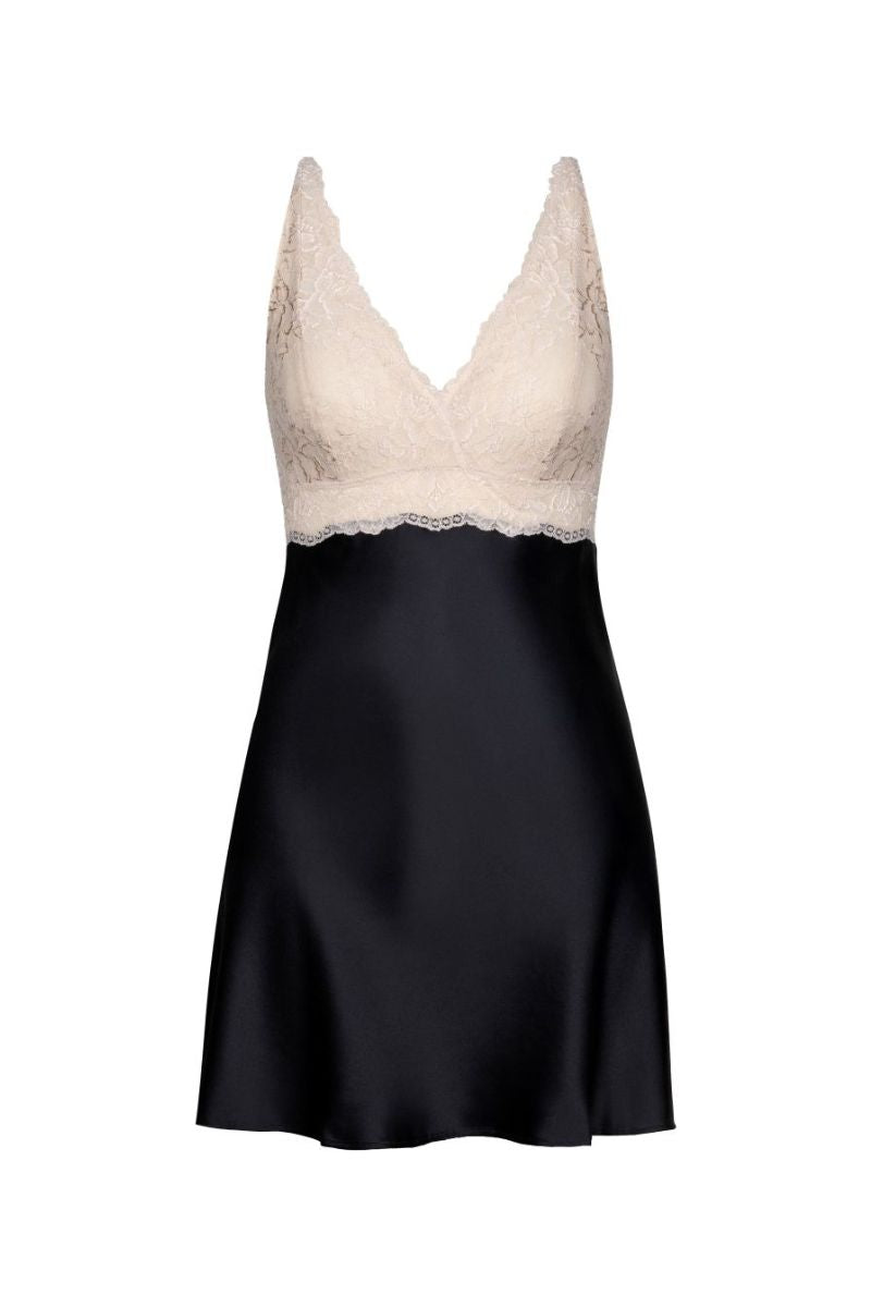 Matières : 100 % soie charmeuse, 93 % nylon / 7 % élasthanne, dentelle