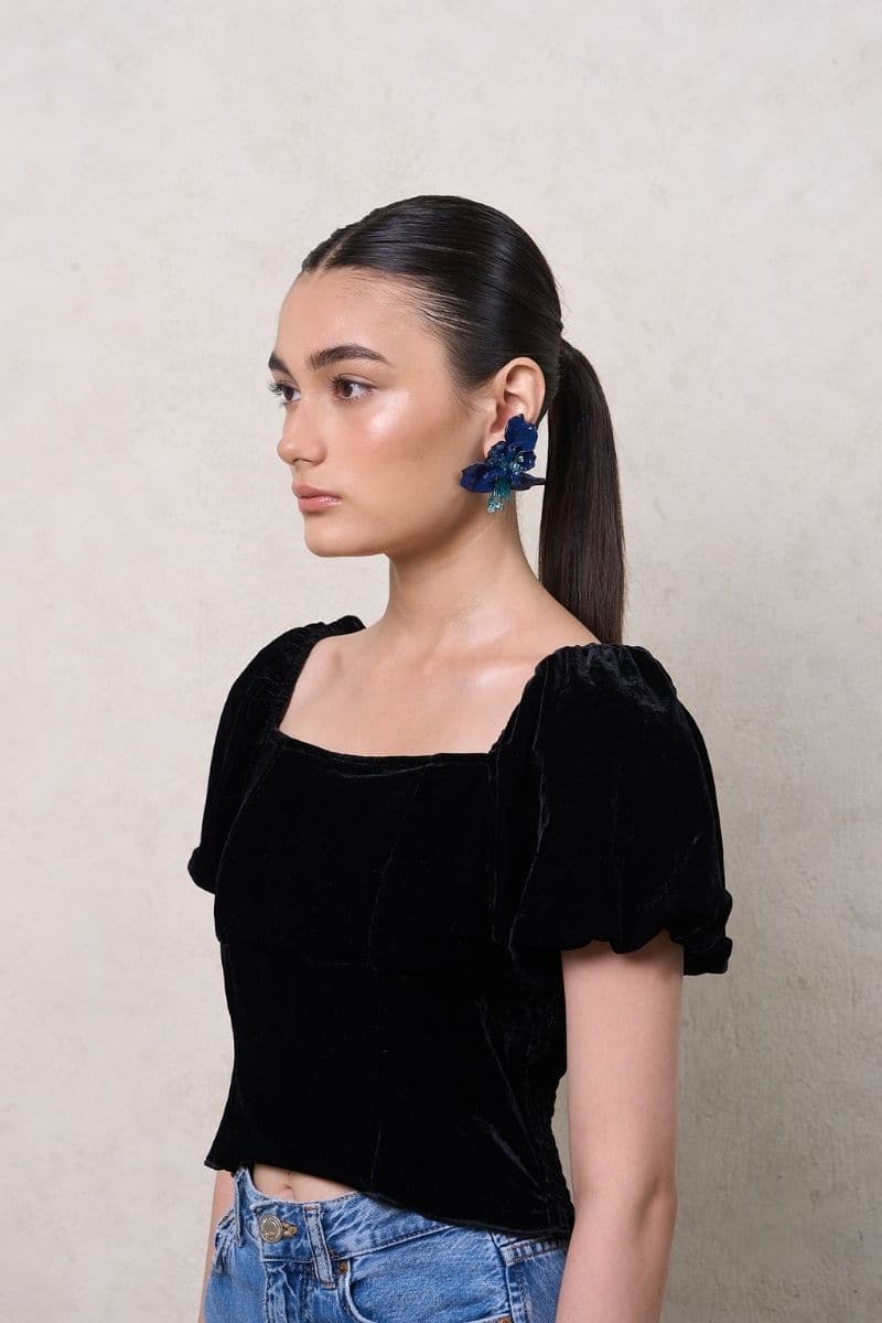 Ces boucles d'oreilles à pois en forme de fleur sont fabriquées à partir de pétales découpés au laser en bleu marine, avec des embellissements 3D de perles et de cristaux acryliques bleus.