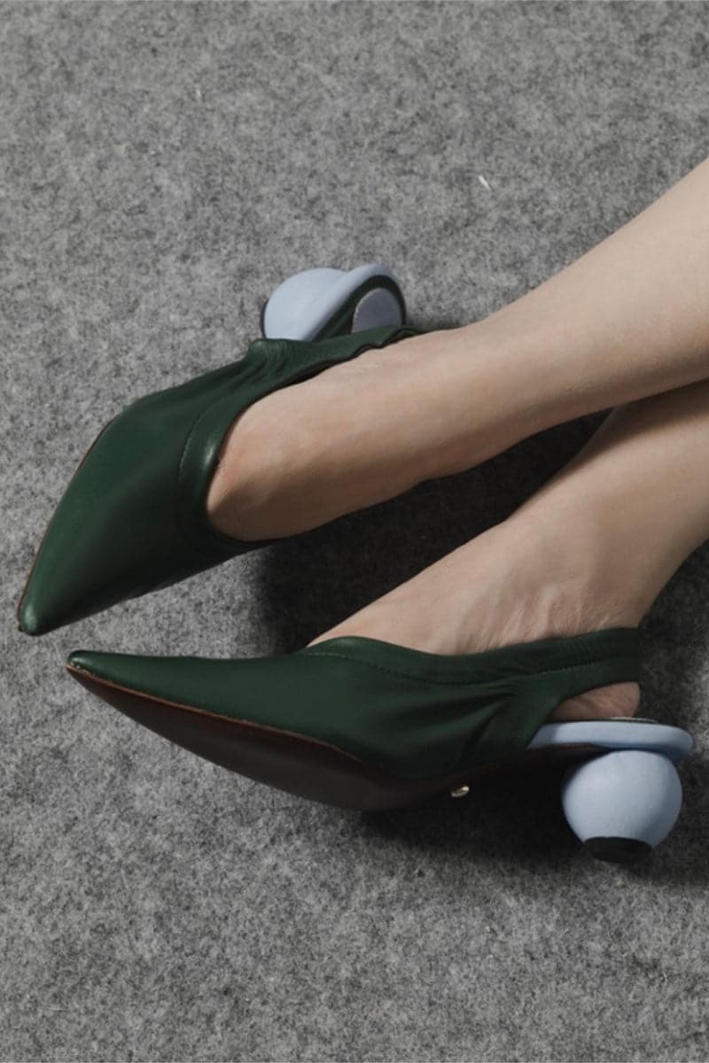Ces MULES PHOEBE TOURMALINE GREEN dégagent un sentiment de sophistication, confectionnées avec un cuir bicolore de couleur contrastée dans un vert forêt profond et un bleu ciel vif. Doublée de cuir luxueux, chaque paire est fabriquée à la main avec des semelles en cuir italien et une hauteur de talon de 35 mm.