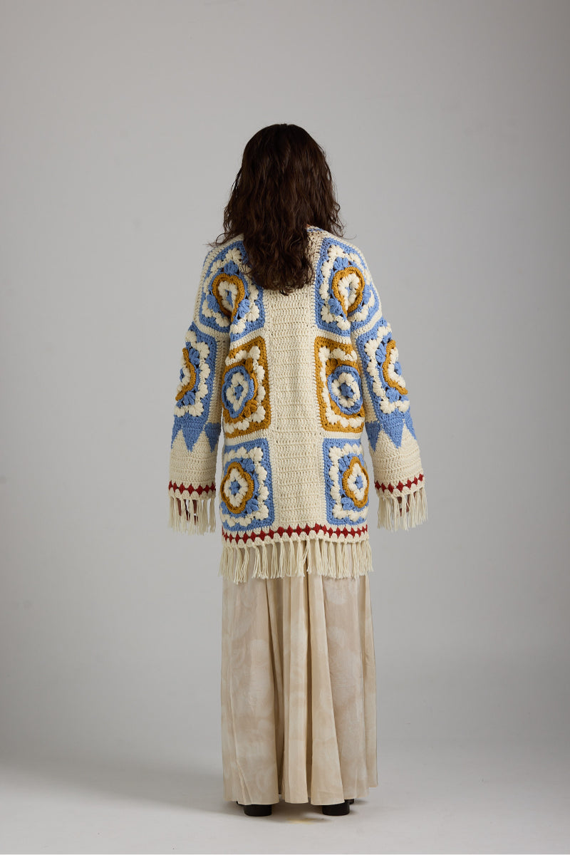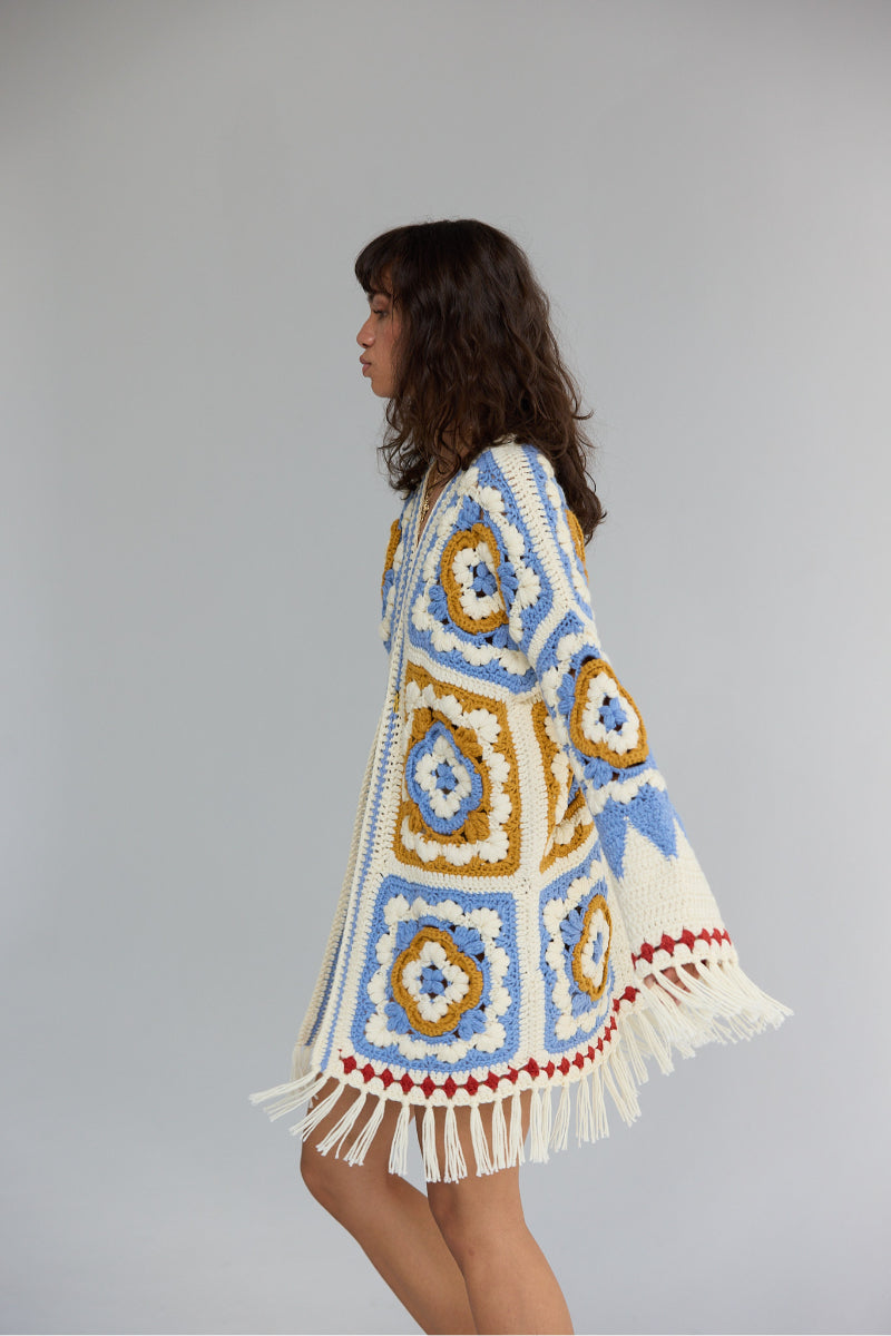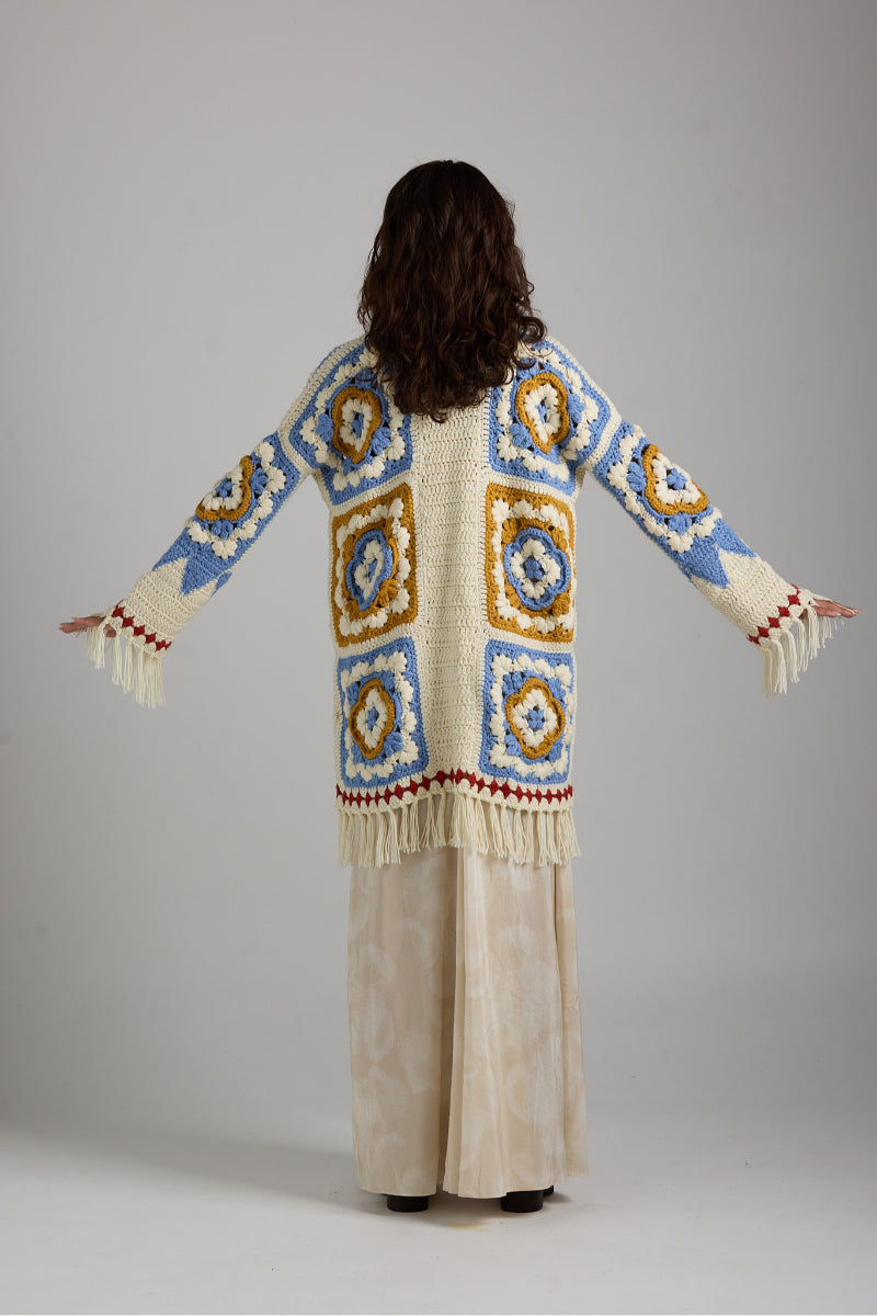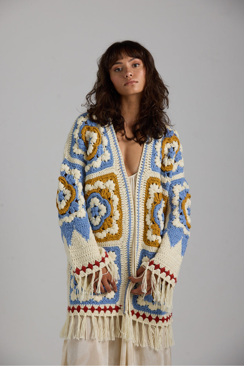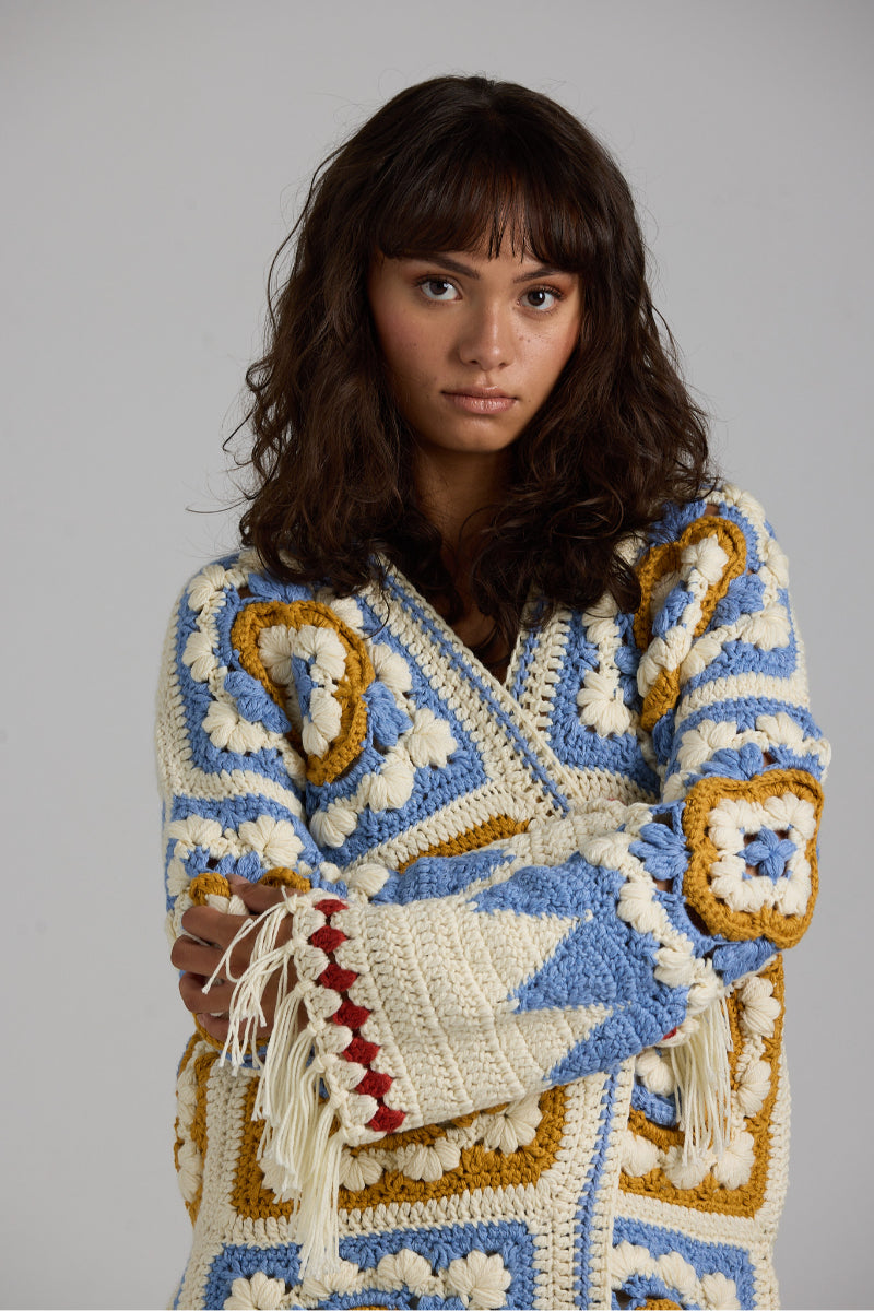Confectionnée à la main avec amour par des artisanes péruviennes expertes, chaque Sienna est une œuvre d'art à porter — ornée de motifs granny square multicolores et vibrants, d'une silhouette enveloppante et surdimensionnée, et réalisée dans un mélange ultra-doux et luxueux de laine mérinos de première qualité et de coton Pima péruvien.