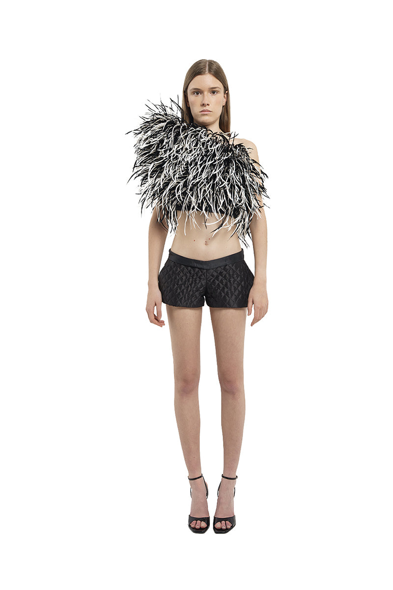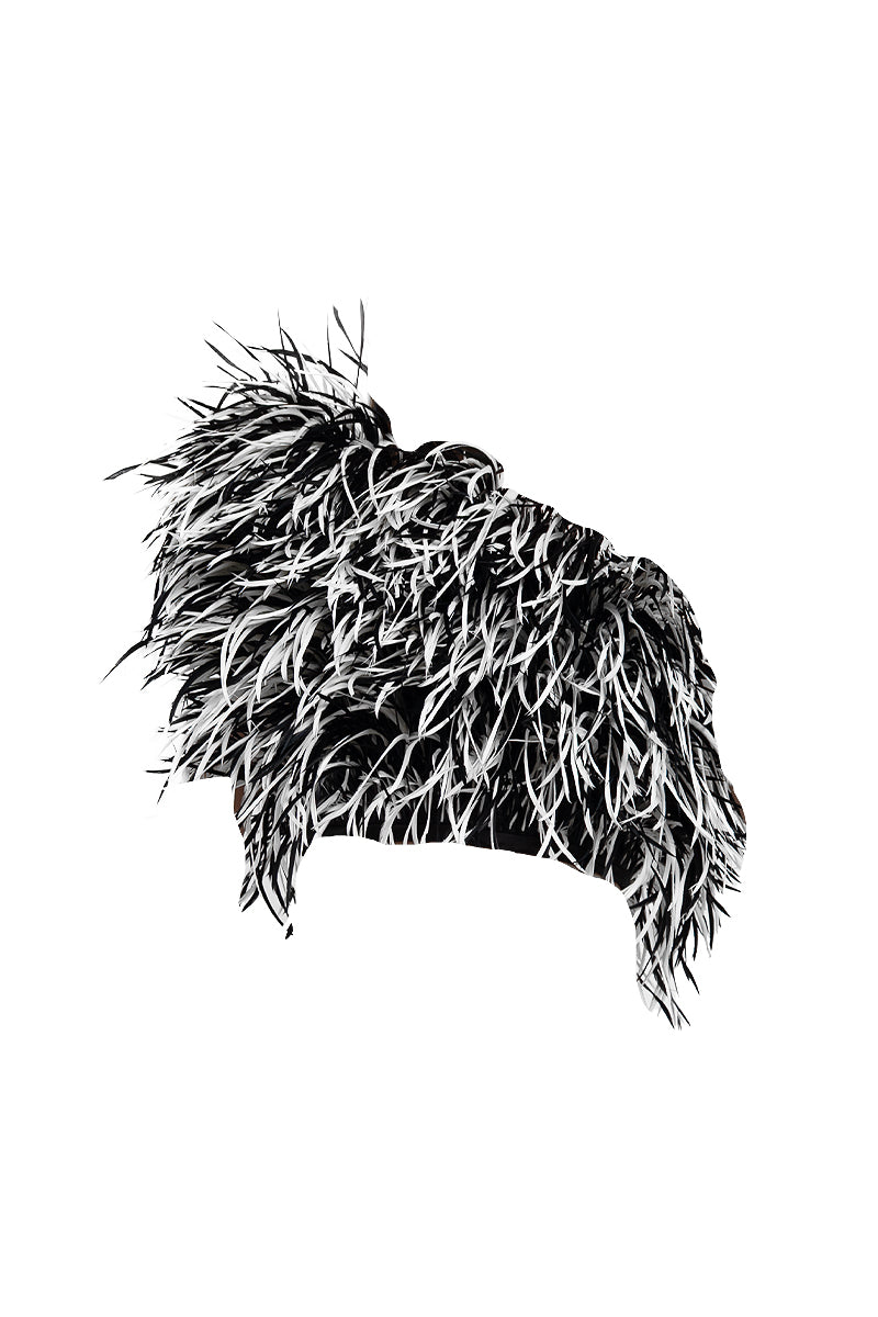 corset asymétrique à plumes en noir et blanc