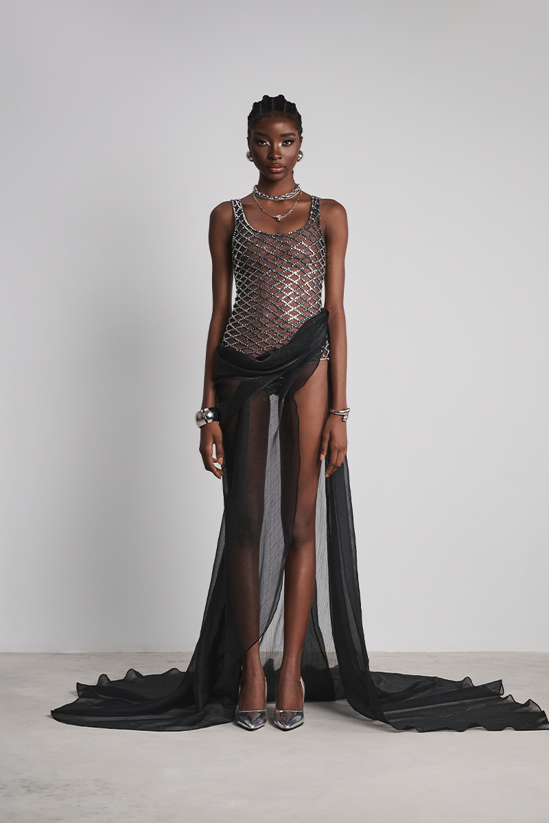 Le design séduisant du body, orné de motifs complexes créés par l'équipe de design de la marque sur du tulle doux, crée une beauté exquise. Il est associé à une jupe en mousseline drapée pour former une fente haute. En portant ce design, les dames de LE THANH HOA seront le centre d'attention à chaque fois qu'elles apparaîtront.