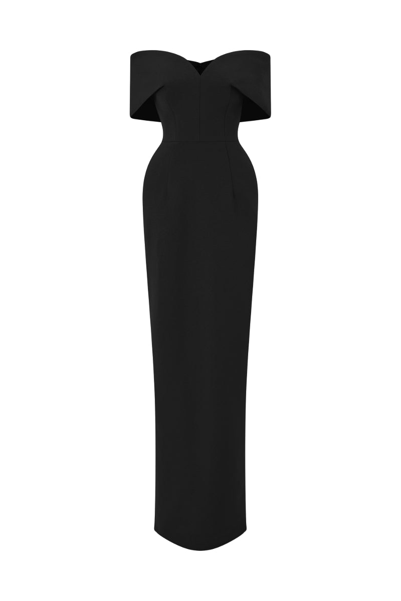 - Robe noire élégante et longue jusqu'au sol.