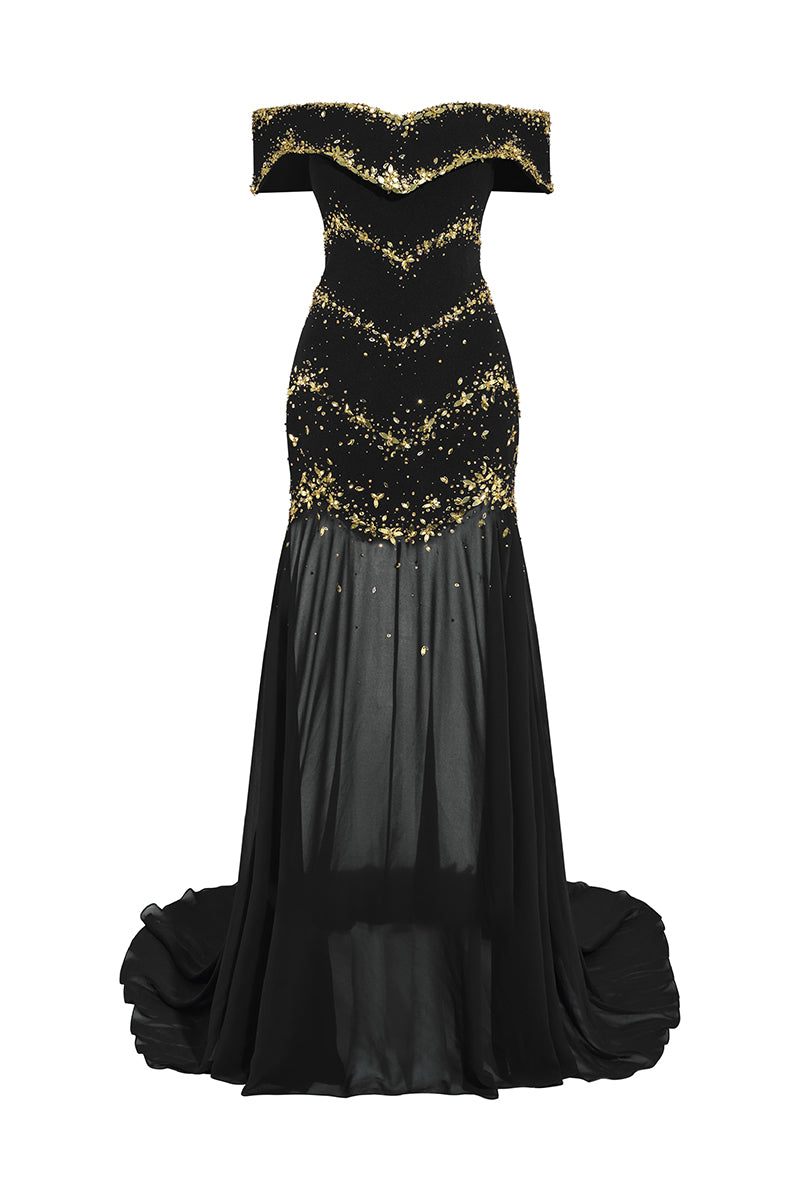 - Tissu noir de jais classique contrastant avec des ornements de sequins dorés éblouissants.